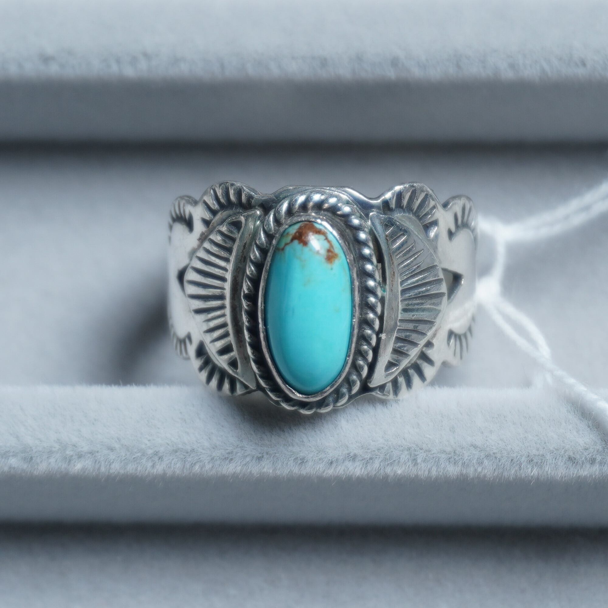 ターコイズストーンが埋め込まれたインディアンジュエリーのリング。ストーン系のリングは指のどこかに差し込みたいと思ってしまいます。