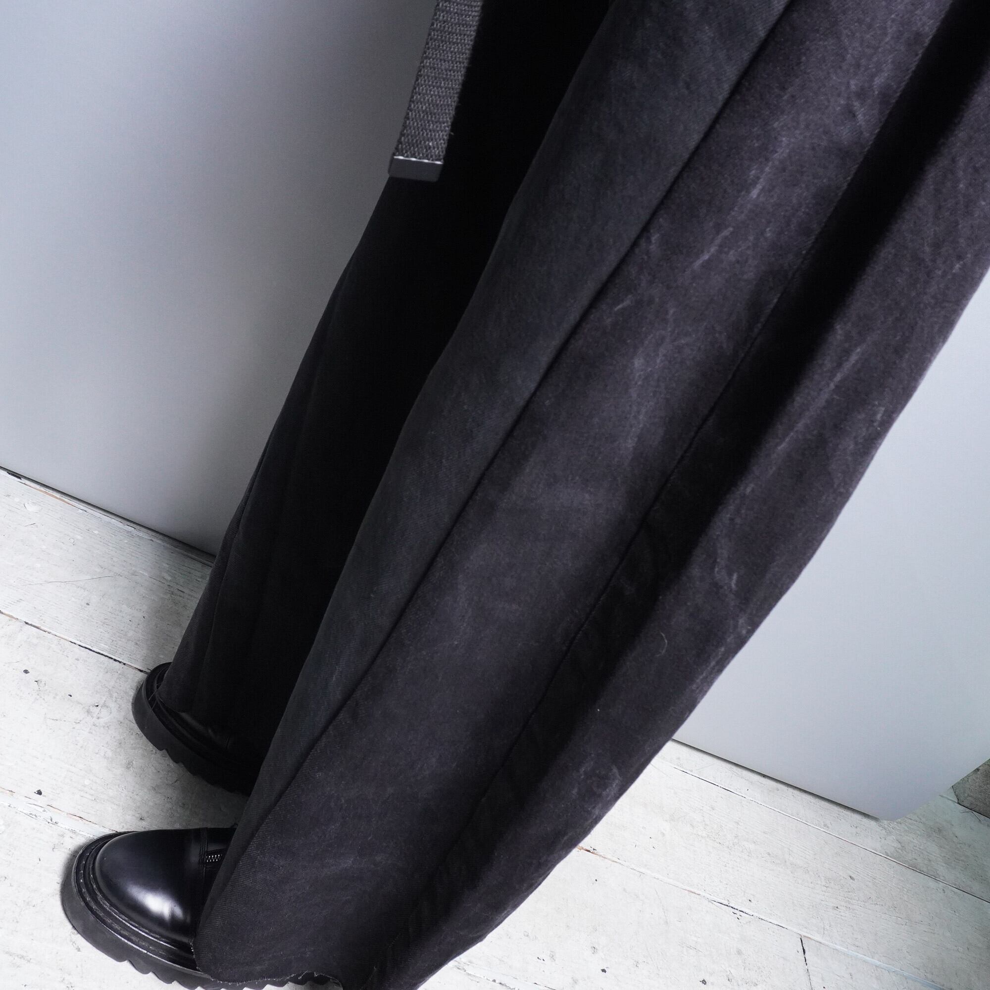 スペシャルリメイク。ドッキング加工を施しウエストから膝までの部分に異なるデニム生地を被せたデザインがモードな印象。袴のような広がりのあるシルエットが、足元にボリュームを与えてくれる逸品。