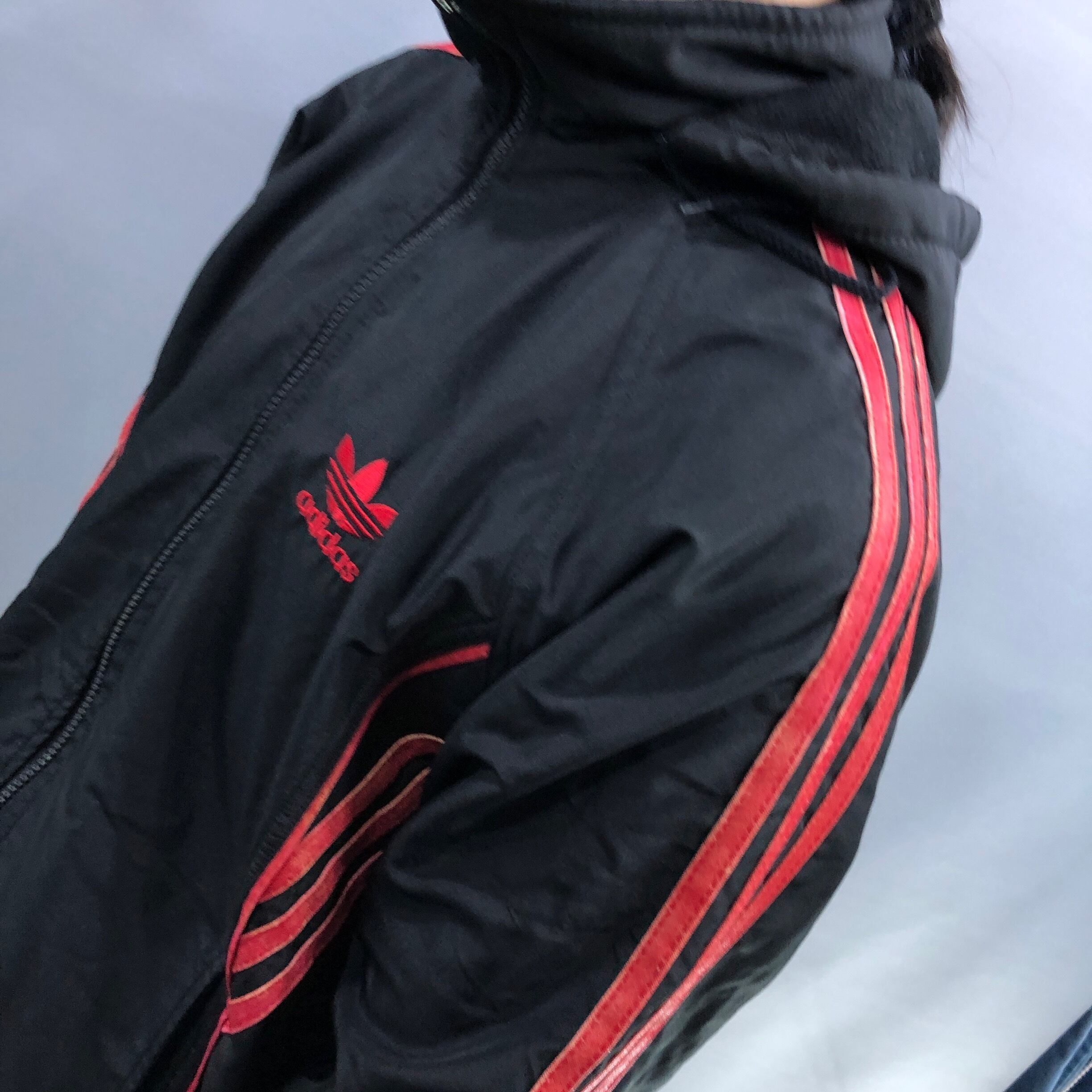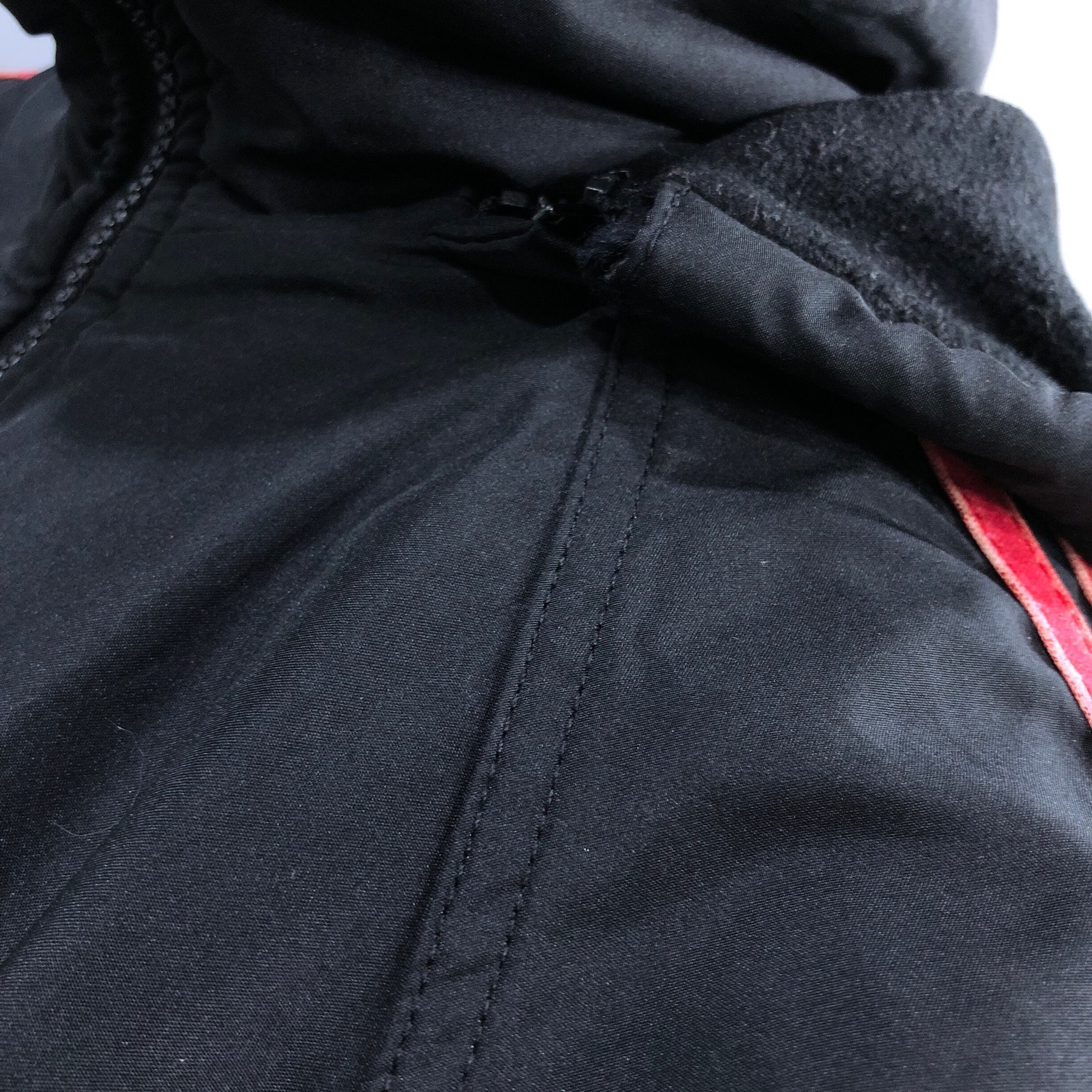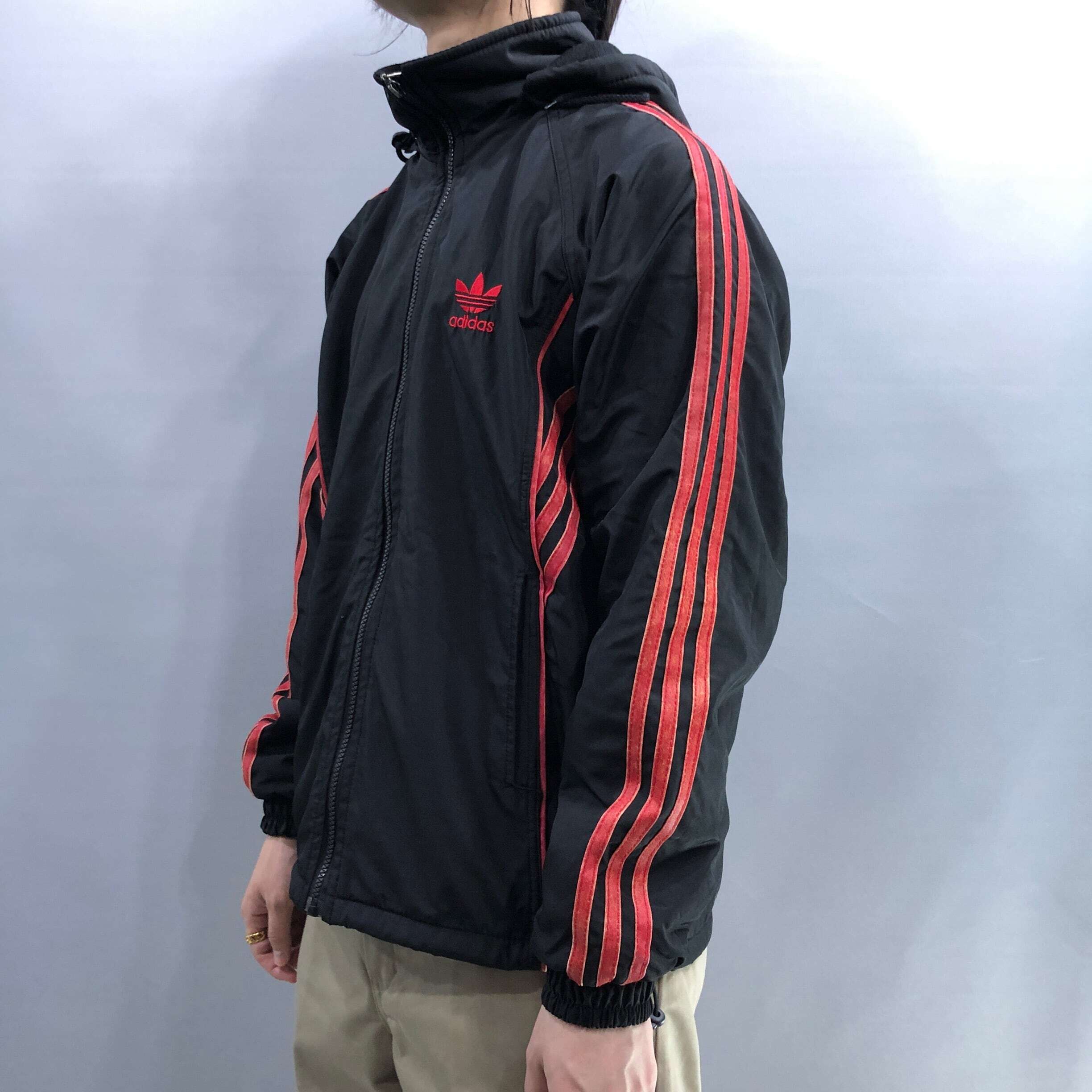 赤黒の配色がオーソドックスかつオーセンティック。フードを取り外せば背中にもトルフォイルロゴが出現。かすれたスリーストライプもアジがあるグッドコンディション。裏フリースになっており肌寒い季節でもあたたかい。
