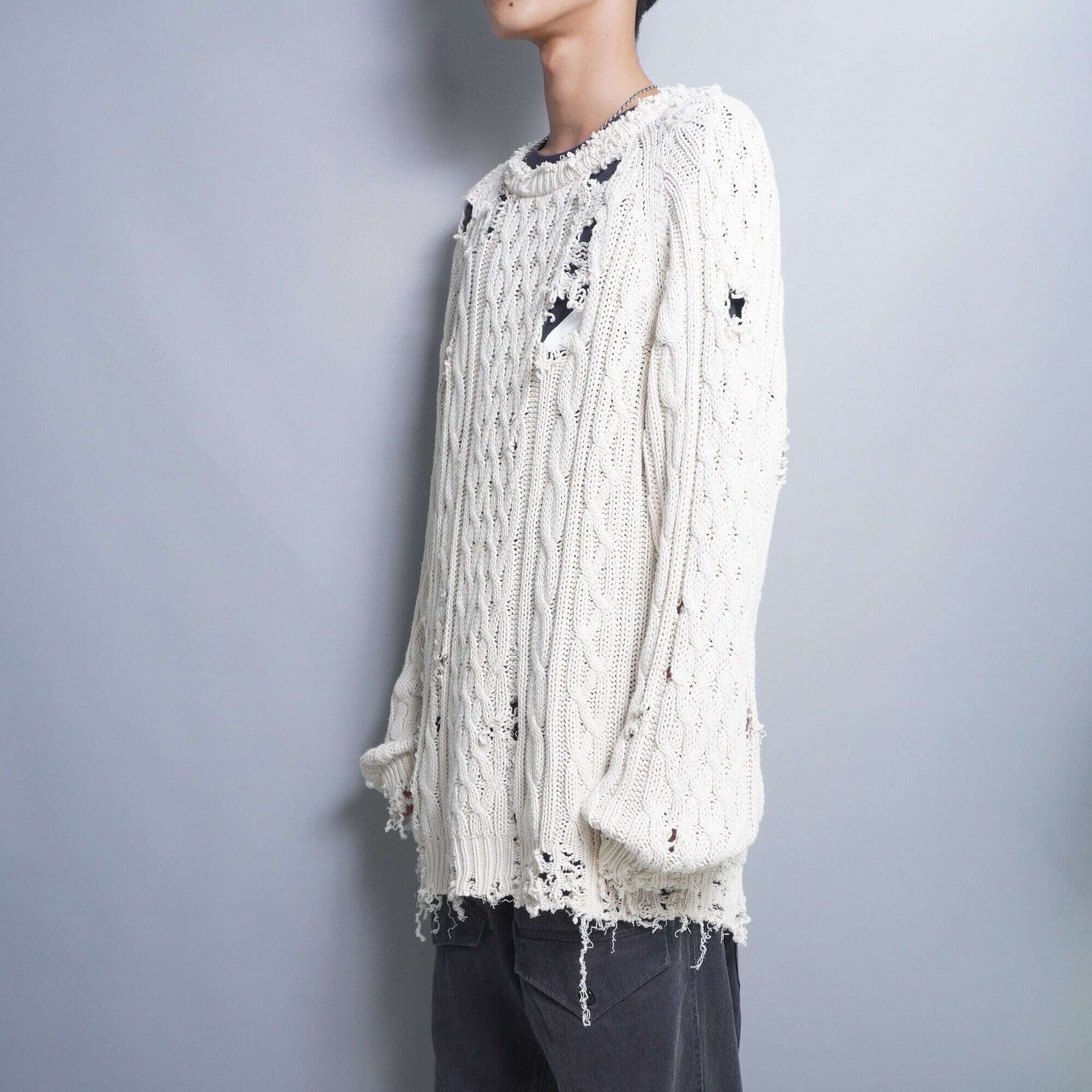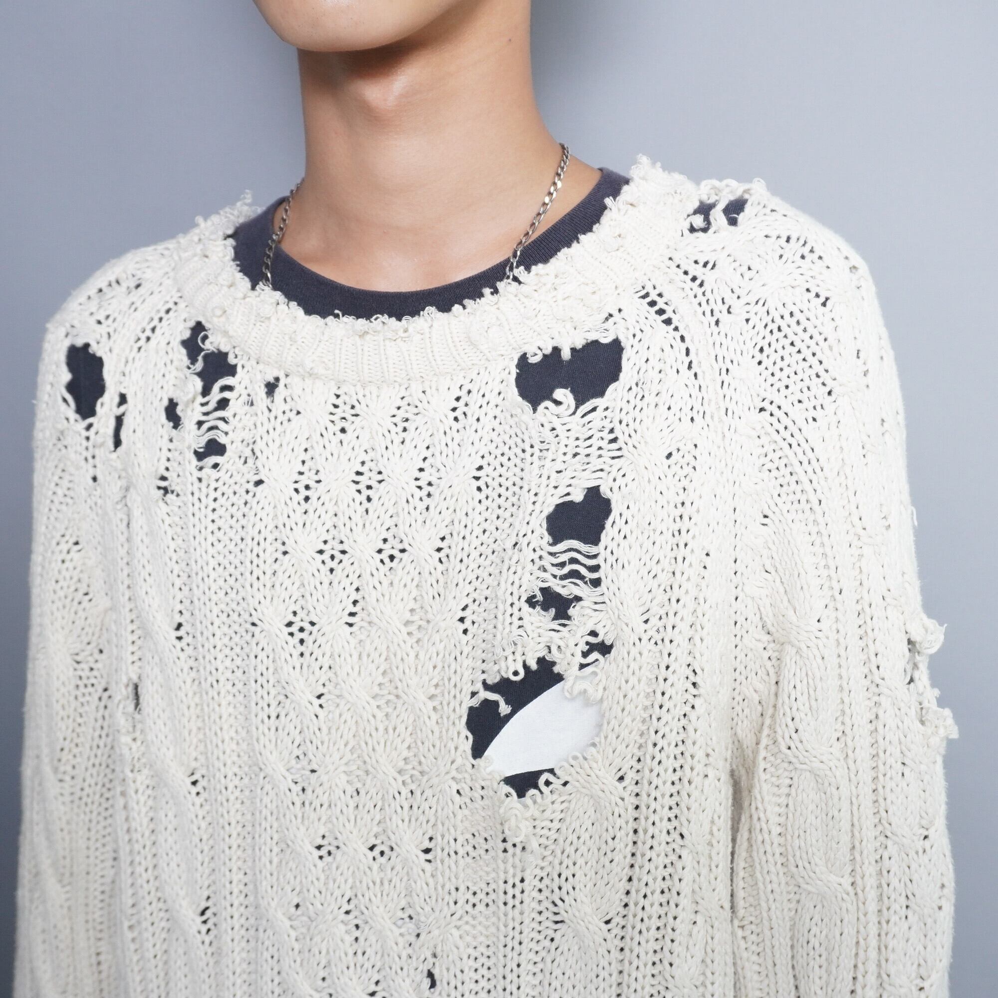 アランニット」とは、「フィッシャーマンニット」とも呼ばれ、生成り色に、美しい立体的な編み模様が特徴的なニットのことです。そのニットにグランジ要素が施された商品です。