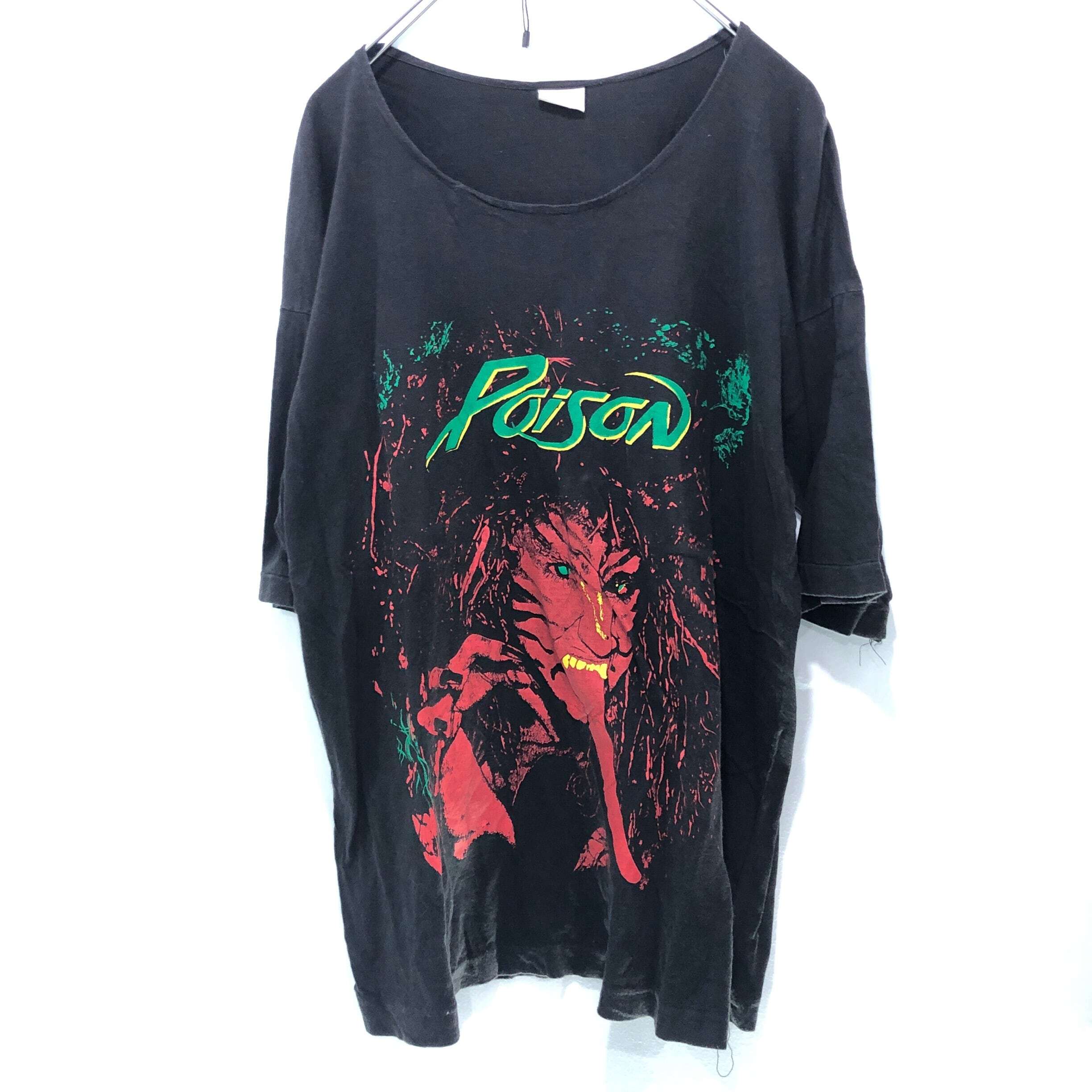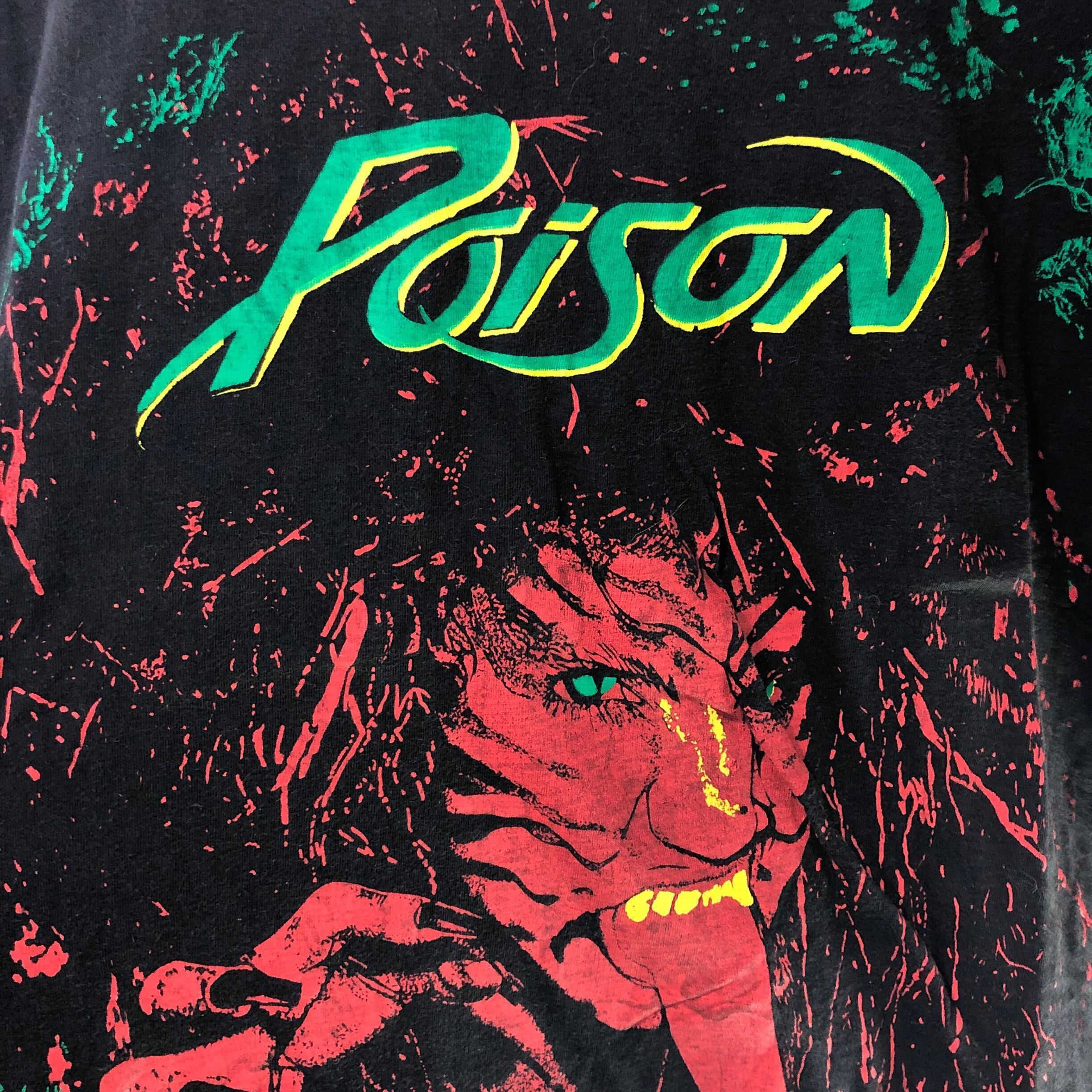 ハードロックバンドpoisonのツアーTシャツ。毒々しく荒々しいプリントがいかにもで、一枚でもインナーとしても存在感を放ってくれる逸品です。