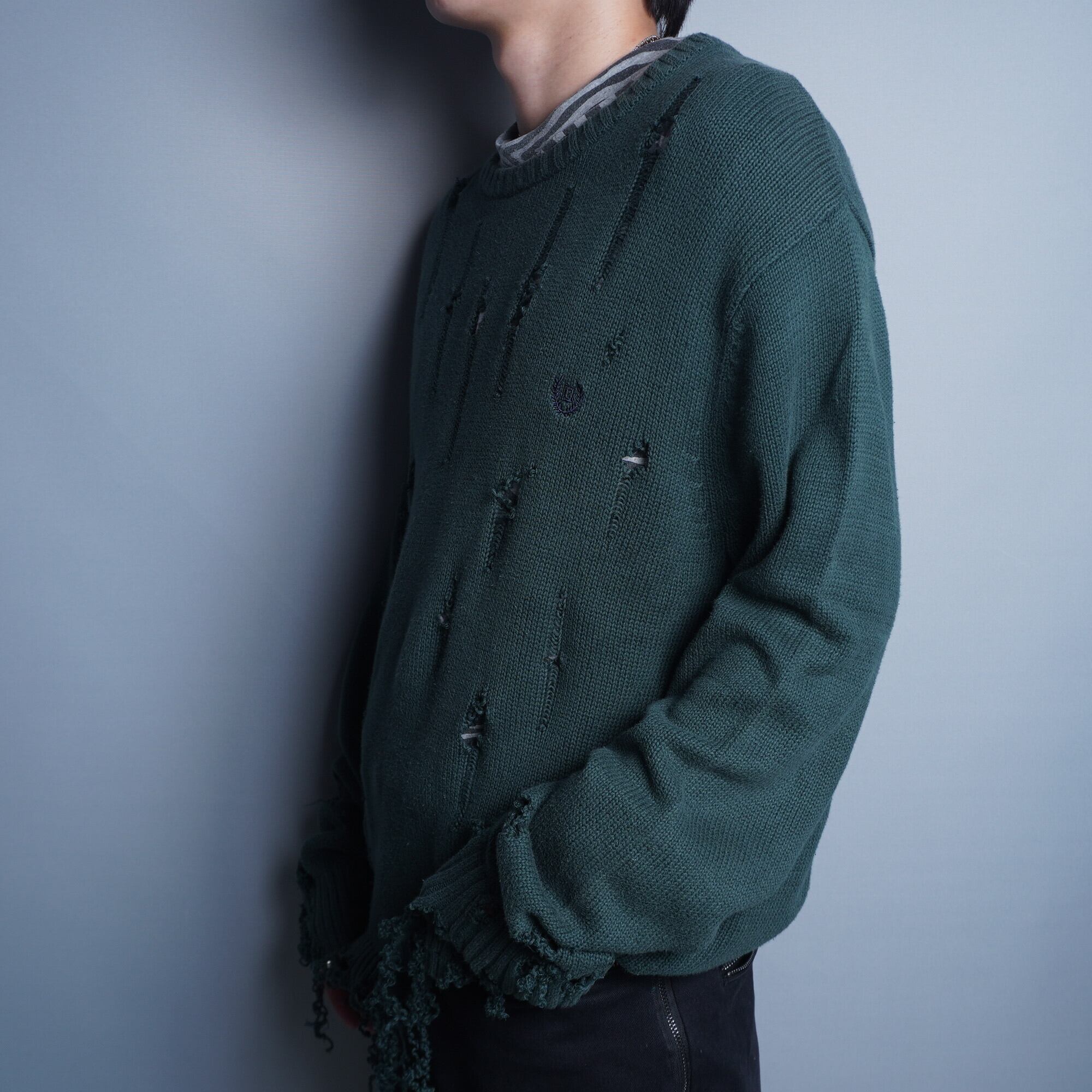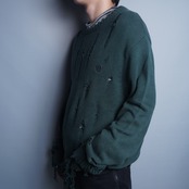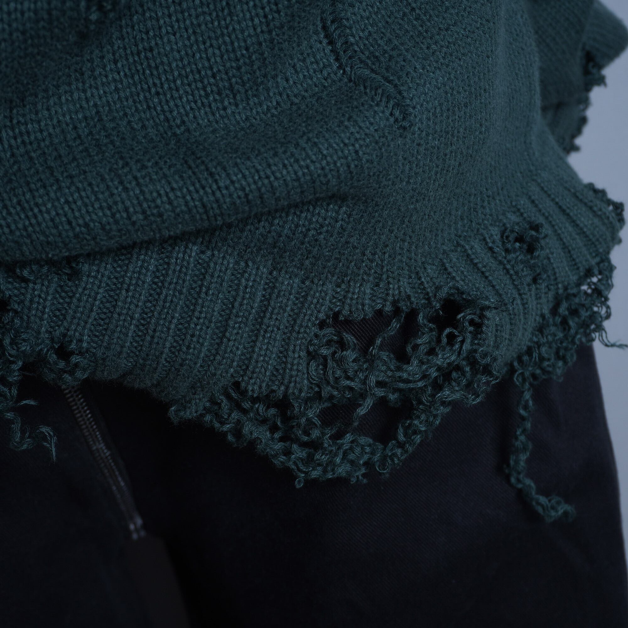 弾痕感のあるデストロイニット。所々切れ込みやダメージ処理が施されたデストロイ調のデザインで、ボリューム感のあるオーバーサイズのシルエットです。1枚でコーデの主役としても、コーデのアクセントにも使える万能アイテムです。